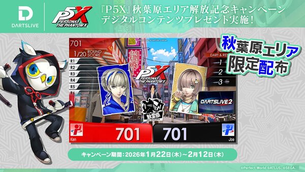 新都市「秋葉原」がゲーム内に登場したことを記念し、デジタルコンテンツが手に入るコラボキャンペーンを開催中。対象店舗でダーツライブを利用した人に、秋葉原エリア限定Ver.のテーマが獲得できるシリアルコードをプレゼント。配布期間は、2026年2月12日まで。