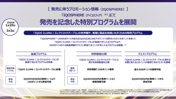 また、1月29日から3月3日まで、IQOS PHEREにて発売を記念した特別プログラムを展開。IQOS ILUMA i エレクトリックパープルが抽選で当たるプログラムのほか、初回視聴でポイントを獲得できる特別動画を公開。最大400ポイントを獲得できるクエストプログラムも実施する。