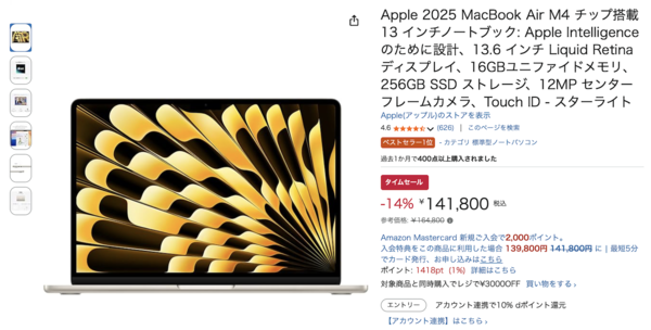 アップル「MacBook Air(13-inch, M4, 2025)」をチェックする