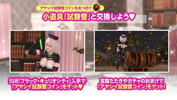 新イベント「ドキドキ♥実験タイム」が開始。イベント前半・後半それぞれで開催される宝箱たたきや、「トレンドコーデガチャ」のおまけなどで入手できる「アヤシイ試験管コイン」を集めて、『小道具「試験管」 観察する』を手に入れよう。