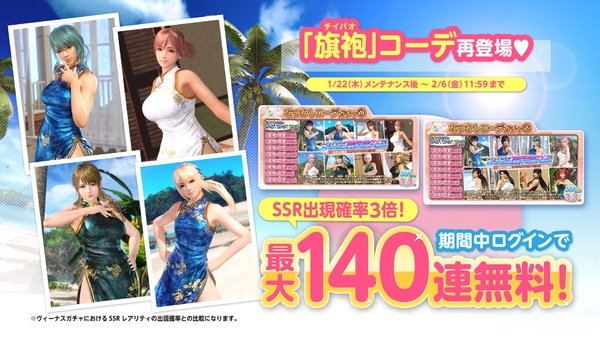 本ガチャでは、登場するSSR水着は「旗袍・青龍」「旗袍・白虎」「旗袍・玄武」のいずれかとなり、SSRの出現確率は3.3%となっている。さらに、ステップ8/8の有償Vストーン限定の10連ガチャでは、登場するSSR水着のいずれか1着を確定で入手できる。