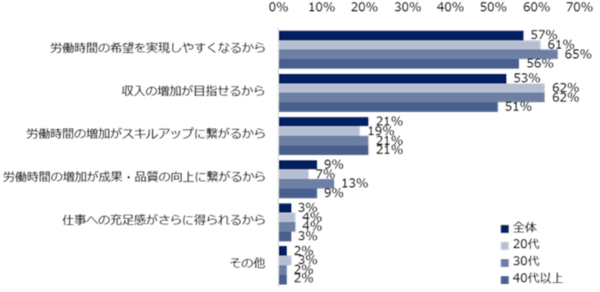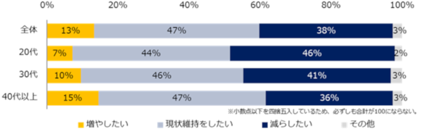 ・労働時間を「増やしたい」は13%。「現状維持」47%、「減らしたい」38%