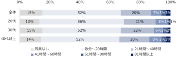 ・現状の月間残業時間、「20時間未満」が7割弱だが、過労死ラインを超える層も3%