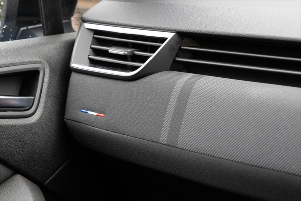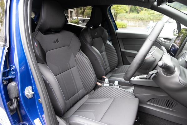 インテリアは大型の9.3インチ縦長ディスプレイが印象的。ダッシュボードやドアパネルはグレーのファブリックとしたほか、シートはよりホールド感を高める形状へとチェンジ。ヘッドレストなどにアルピーヌの「A」のロゴが入り、スポーティーな印象を強めています。シートベルトをはじめ、各所に青いステッチが入るのもアルピーヌっぽくて素敵です。