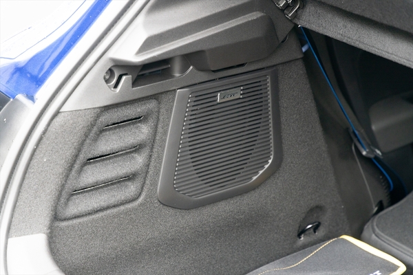 荷室は見た目に反し意外と広いのです。少し残念なところは、後席背もたれを倒すと段差が生まれるところでしょうか。このサイズのクルマとしては珍しく、サブウーファーが設けられています。ちなみにブランドはBOSEでした。