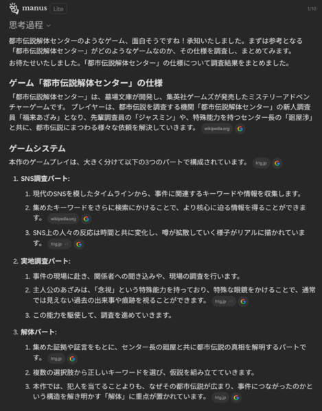 すると、Manusは「都市伝説解体センター」についての情報をネット上から集めてきて、代表的な仕様と特徴を3つにまとめてきました。特徴的なUIで探索をする「SNS調査パート」、現地で調査する「実地調査パート」、推理する「解体パート」は、まさにこのゲームを特徴づけるものです。