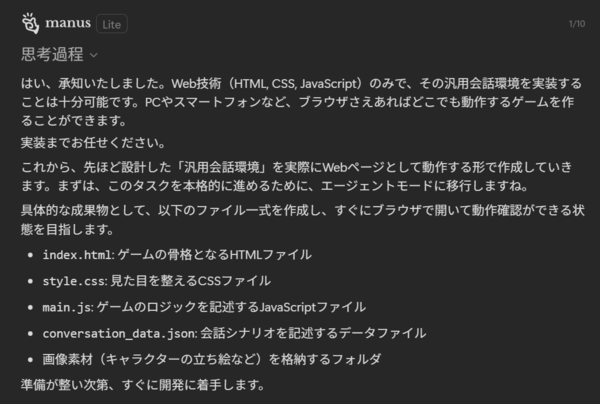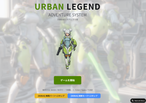 そのうち、ゲームの基本部分の「実地調査パート」を中心に作ってみることにしました。「都市伝説解体センター」はもともとUnityで開発されたようですが、Web技術でも開発が可能かとManusに確認したところ「はい、Web技術(HTML/CSS/JavaScript)のみで、汎用会話システムを構築することは十分に可能です。ReactやVueなどのフレームワークを使わずに、ピュアなJavaScriptとCSSを使って、軽量でカスタマイズしやすい環境を作成しま。」との返答があったので、すべて任せて開発を進めさせました。