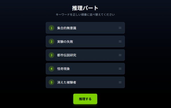 このゲームでは、キャラクターを操作して、人物(水色)とオブジェクト(赤)に接触して、会話イベントを通じて、キーワードを収集していきます。5つのキーワードを収集すると、推理モードに移行し、何が起きたのかをワードを並べて推測するという仕組みになっています。シナリオも、サンプルをManusに作成させました。1日もやり取りを繰り返すと、インタラクションができるモックが具体化します。