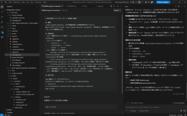 Manusで作成したコードをダウンロードしたフォルダを読み込ませ、それをローカル環境でスタンドアローン動作する形で移植するように指示しました。AIは移植計画を作成し、それを実行していきます。コードを分析して、npmの環境構築から始まり、依存関係のインストール、ビルドまでが一気に進みました。途中で色々なファイルをネットからダウンロードしてよいか、ファイルの変更をしてよいかといった確認が入ってきますが、その都度「Accept」(承諾)ボタンを押し続けるだけで、どんどん進んでいきます。