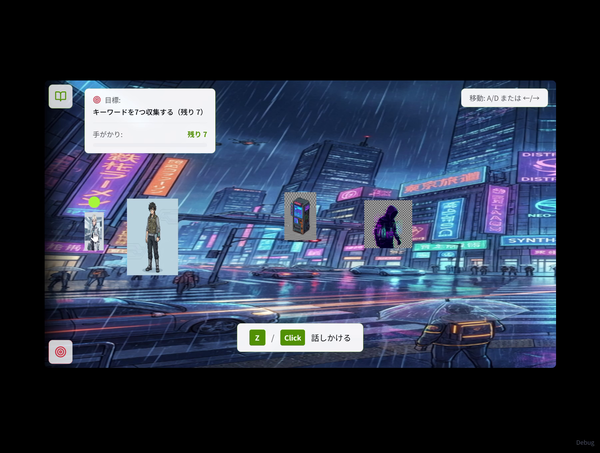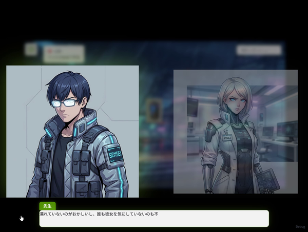 この後、様々な新機能も開発していきました。ストーリーを完全にオリジナルにするために、過去に筆者が書いていた短編をベースにすることにしました。どうせならと、サンプルシナリオも、AIに考えさせることとします。筆者が書いている短編「百夜アンドロイド記」の一部の話を読み込ませ、近未来のサイバーパンク的な世界案を作り、さらに、ストーリー案を作らせました。筆者の文章やセリフの言い回しの癖も分析させ、それをセリフの作成時に反映させるようにしました。