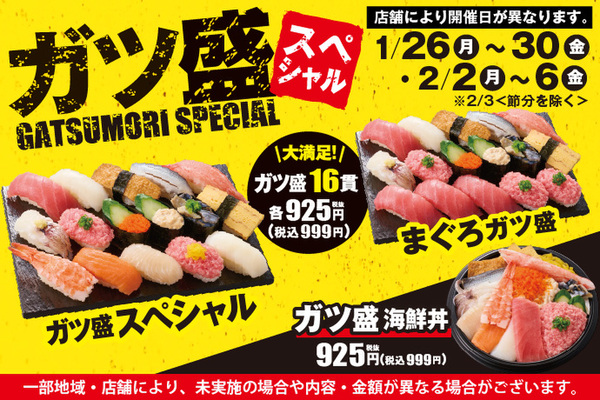 小僧寿しは1月26日~30日・2月2日~6日の期間限定で「ガツ盛スペシャルフェア」を開催する(2月3日を除く)。
