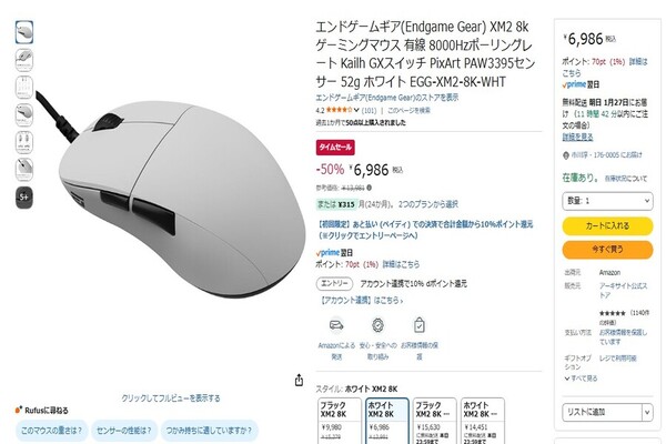 Amazon.co.jpにて、エンドゲームギアの有線ゲーミングマウス「XM2 8K」(ホワイト)が販売中だ。参考価格は1万3981円だが、タイムセールにより50%オフの6986円で購入できる。