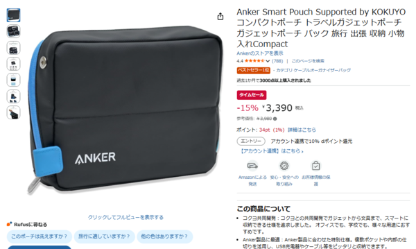 コクヨと共同開発したAnkerのガジェットポーチ「Anker Smart Pouch Supported by KOKUYO」が参考価格3,980円から15%オフの3,390円で、Amazonタイムセールに登場!