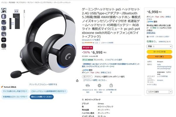 Amazon.co.jpにて、Gtheosのゲーミングヘッドセット「Captain 370」が販売中だ。過去価格は1万5999円だが、タイムセールにより56%オフの6998円で購入できる。