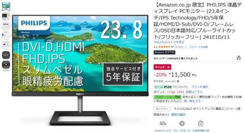 PHILIPSの液晶ディスプレイ「241E1D/11」(23.8インチ)がAmazonのタイムセール対象です。参考価格14,364円のところ、20%オフの11,500円で販売中です。