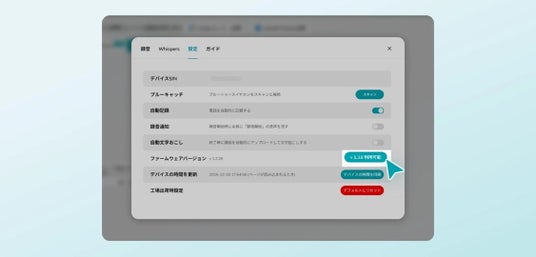 リアルタイム翻訳機能を使うには、HiDock P1のファームウェアをv 1.3.8にアップデートする必要があります。利用可能な最新バージョンは、HiNotesのデバイス設定画面から簡単に確認できます。