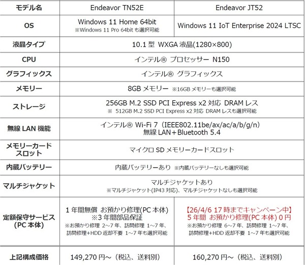 「Endeavor TN52E」および「Endeavor JT52」は、10点マルチタッチ対応の10.1型WXGA(1280×800ドット)液晶を搭載するタブレットPC。CPUはIntel N150で、メモリー容量は8GB(16GBも選択可能)、SSD容量は256GB(512GBも選択可能)。