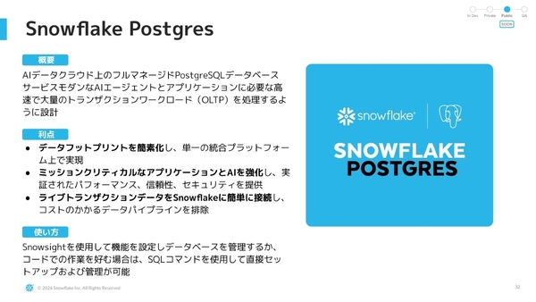 現在パブリックプレビュー中なのが、 PostgreSQLをSnowflake環境に取り込んだ「Snowflake Postgres」だ。これは、PostgreSQLのマネージドサービスを手掛けるCrunchy Dataの買収により実現している。OLTP領域のDBaaSを提供することで、AI時代に求められる高速で大量のトランザクションワークロードにも対応していく。