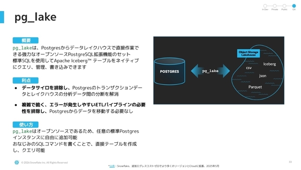 さらに、PostgresSQLをデータレイクハウスとして機能させる「pg_lake」をオープンソースとして公開している。Snowflake Postgresから直接、Apache Icebergテーブルを作成、管理、クエリできるようにする拡張機能で、「データレイクハウスにデータを蓄えて、データの非サイロ化やゼロETLを実現して、複雑性を排除できるのが強み」(田中氏)だという。