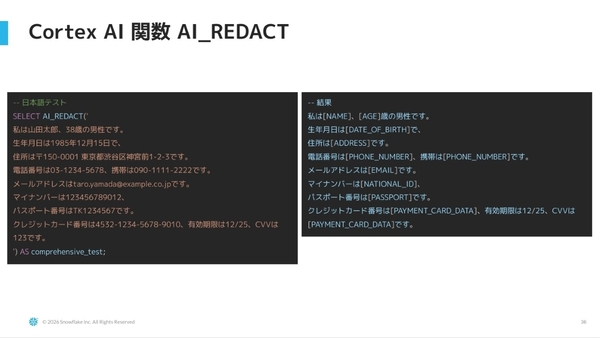マネージドなAI機能群である「Cortex AI 関数」では、「AI_REDACT」という機能が追加されている。個人情報を自動でマスキングする関数であり、日本語にも対応。SQLで関数を指定して文章を入れると、LLMが個人を特定できる情報を検知して、プレースホルダー値に置き換えてくれる。