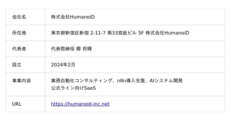 株式会社HumanoiD(本社:東京都新宿区、代表取締役:郷 将輝)は、企業のデジタルトランスフォーメーション(DX)を加速させるため、ノーコード自動化ツール「n8n」の導入から内製化までを支援するサービスにおいて、新たに「3つの約束」を掲げた新プランの提供を開始することをお知らせいたします。サービスサイト:https://n8n.humanoid-inc.net/