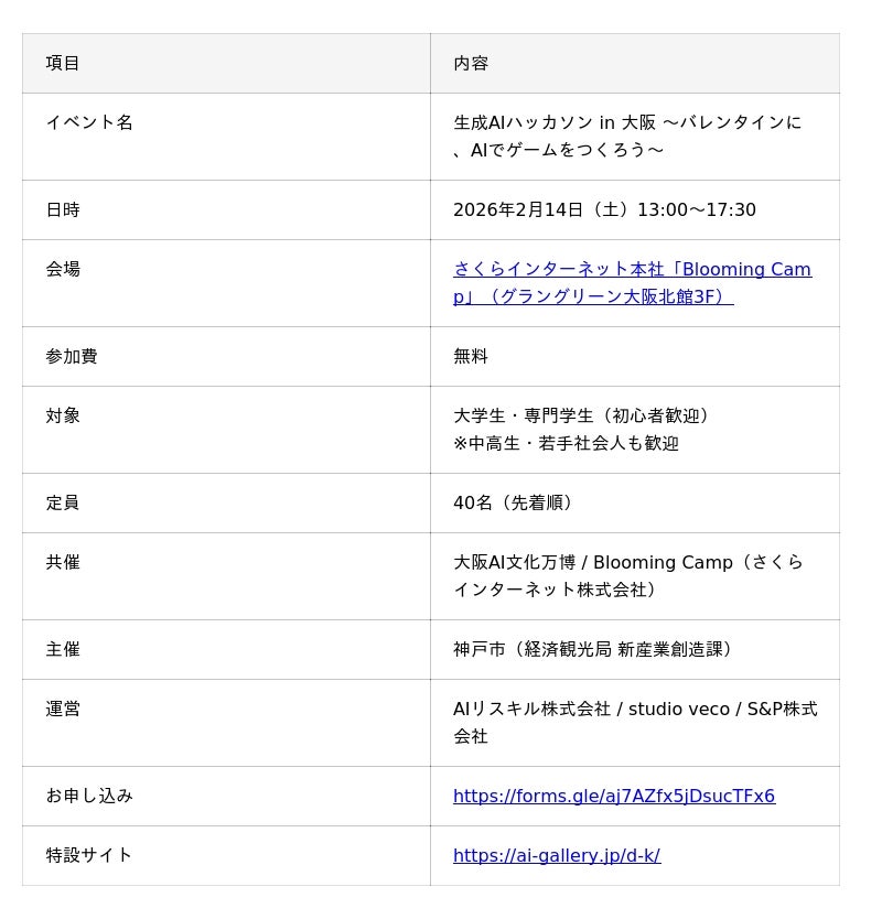 AIリスキル株式会社(本社:大阪市北区、代表取締役:山原慎也)は、神戸市が推進する学生向けデジタル人材育成プロジェクト「こうべデジタル活動部(デジ活)」の一環として、大阪AI文化万博・Blooming Camp(さくらインターネット株式会社)との共催イベント「生成AIハッカソン in 大阪」を2026年2月14日(土)に開催いたします。