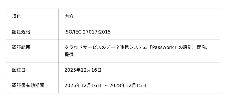 株式会社Prazto(本社:東京都中央区、代表取締役:芳賀怜史、以下「Prazto」)は、当社が開発・提供するクラウドサービスのデータ連携システム「Passwork」において、ISMSクラウドセキュリティ認証である「ISO/IEC 27017」を2025年12月16日付で取得いたしましたことをお知らせいたします。
