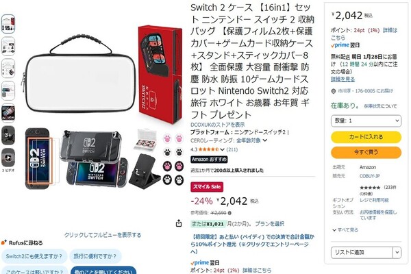 Nintendo Switch 2に欠かせない保護アイテムをまとめて購入できる点が魅力となっている。参考価格は2690円のところ、プライム会員限定ながらセール期間中は24%オフの2042円で購入可能だ。