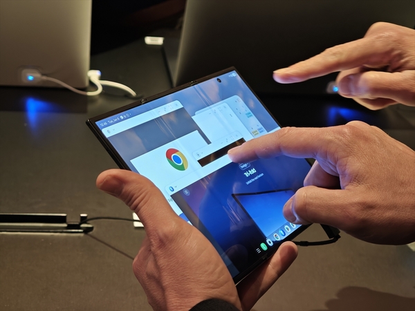 折りたたんでいる時は、少し厚みのある普通のスマホ。しかし、ひとたび画面を左右に広げれば、そこには10型の巨大なディスプレーが広がります。これは、もはや「持ち運べるパソコン」と言っても過言ではありません。