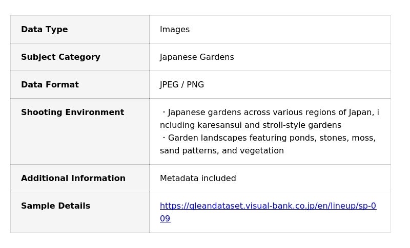 本データセットは、日本各地に存在する枯山水庭園や回遊式庭園を対象に撮影された画像で構成されており、池、石組、苔、砂紋、植栽といった要素を含む庭園景観を収録しています。池や石組、植栽などの自然要素と、意匠として配置された構造物が混在する景観を含むため、景観・空間デザイン領域を含む生成系AIの学習データの一部として利用できます。