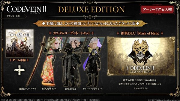 本日2026年1月27日より『CODE VEIN II』のアーリーアクセスおよびパッケージ限定版の先行販売が開始している。ダウンロード版の「Ultimate Edition」「Deluxe Edition」を購入するとゲームを一足早くプレイできる、アーリーアクセスが可能だ。