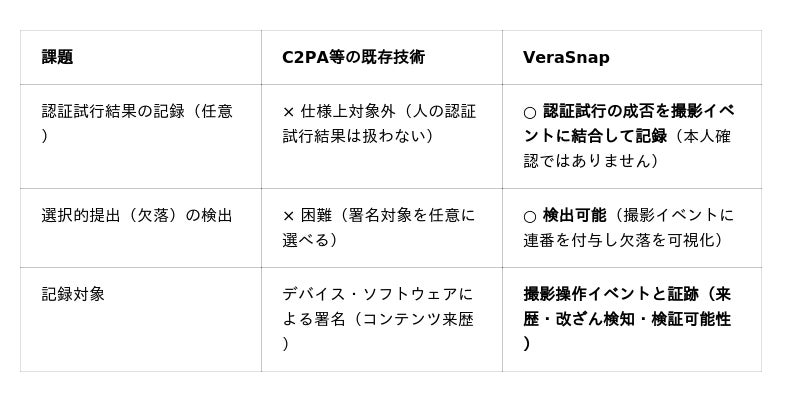 A. C2PAは「コンテンツの来歴と編集履歴」を記録する優れた標準ですが、「誰が撮影したか」は証明しません。C2PA仕様は人間のアイデンティティへのバインディングを明示的に設計から除外しています。VeraSnapはC2PAと競合ではなく補完関係にあり、両方を組み合わせることでより強い検証可能性を実現します。