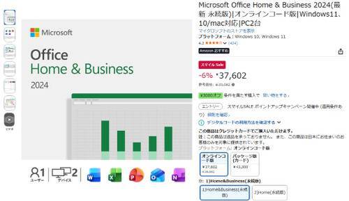 Microsoftのオフィスソフト「Microsoft Office Home & Business 2024(永続版/オンラインコード版)」が、Amazonスマイルセールの対象になっています。参考価格39,982円のところ、6%オフの37,602円で販売されています。