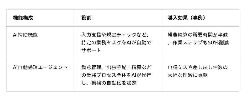 今回のアップデートでは、AI補助機能と業務代行エージェントの双方を拡張することで、バックオフィス業務をAIが支援・自動処理できる構成へと進化しました。すでに「勤怠管理エージェント」や「出張費精算エージェント」、「購買申請エージェント」や「人事評価エージェント」が利用可能です。