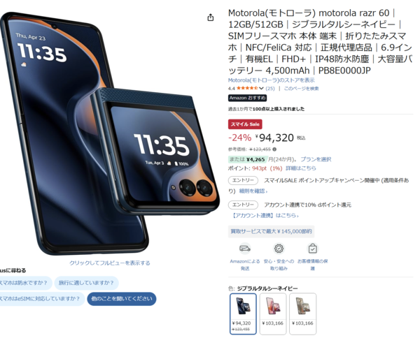 Motorolaの折りたたみスマホ「motorola razr 60」が、1月27日に始まった「AmazonスマイルSAL」の対象になっています。参考価格12万3,455円のところ、24%オフの9万4,320円で販売中です。