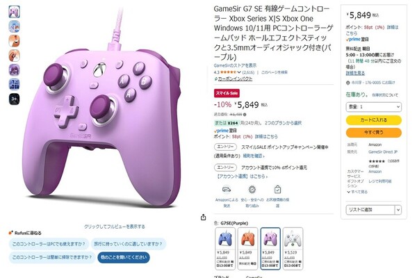 Amazon.co.jpでは、2月2日23時59分まで「AmazonスマイルSALE」が開催中だ。今回はGameSirのXboxコントローラー「G7 SE(Purple)」を紹介したい。過去価格は6499円だが、セール期間中は10%オフの5849円で購入できる。