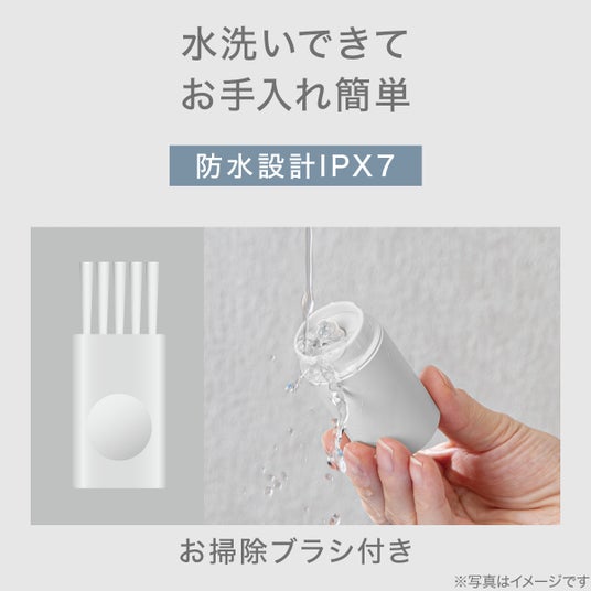 IPX7の防水設計なので、使用後は本体を丸ごと水洗いできて清潔。ヘッドの取り外しが可能で、お掃除ブラシが付属するので、お手入れも簡単です。