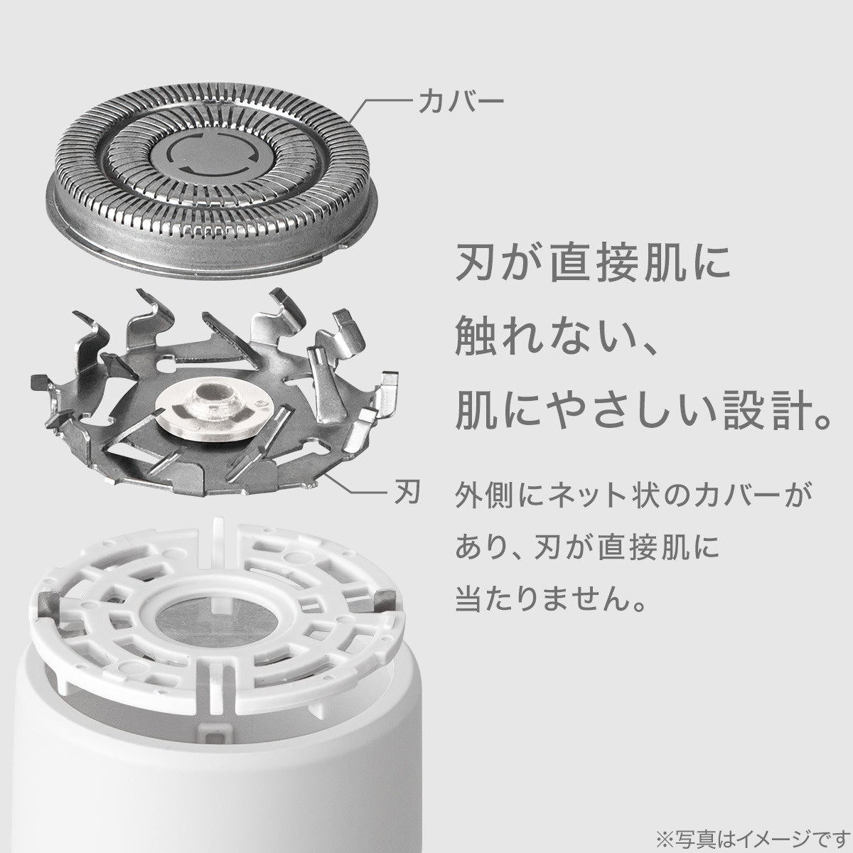 外側にネット状のカバーがあり、刃が直接肌に当たらない安全設計。子どもから大人まで、デリケートな肌にも使いやすい設計です。