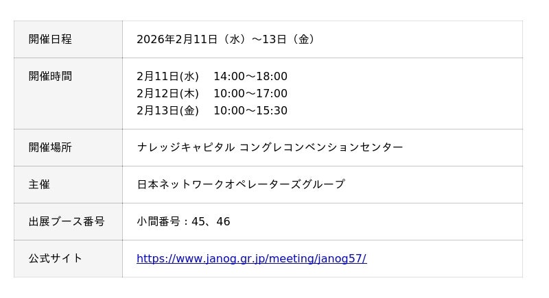 エレクトロニクス商社の丸文株式会社(代表取締役社長 兼 CEO / COO︓堀越裕史、本社︓東京都中央区、以下、丸文)は、2月11日(水)~13日(金)にナレッジキャピタル コングレコンベンションセンターで開催される「JANOG57 Meeting」に出展します。