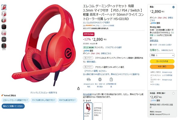 Amazon.co.jpでは、2月2日23時59分まで「AmazonスマイルSALE」が開催中だ。今回はエレコムのゲーミングヘッドセット「HS-G01RD」を紹介したい。過去価格は3270円だが、セール期間中は12%オフの2890円で購入できる。