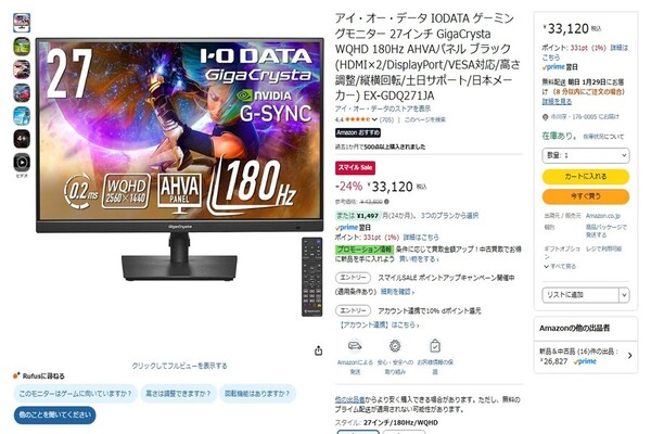 Amazon.co.jpでは、2月2日23時59分まで「AmazonスマイルSALE」が開催中だ。今回はアイ・オー・データ機器のゲーミングディスプレー「EX-GDQ271JA」を紹介したい。参考価格は4万3800円だが、セール期間中は24%オフの3万3120円で購入できる。
