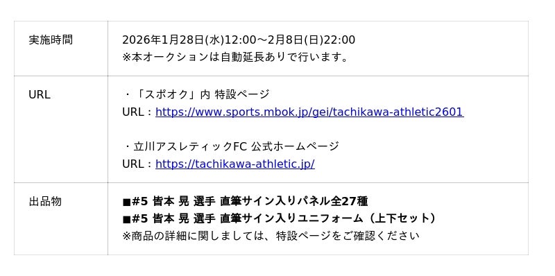◆【立川アスレティックFC 皆本晃 現役引退メモリアルオークション 概要】