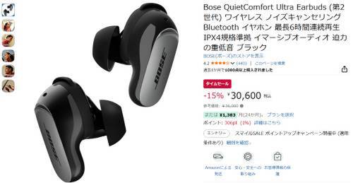 QuietComfort Ultraの名のとおり、シリーズの中では上位に位置づけられるモデルで、タイムセールでは15%オフの30,600円となっています。