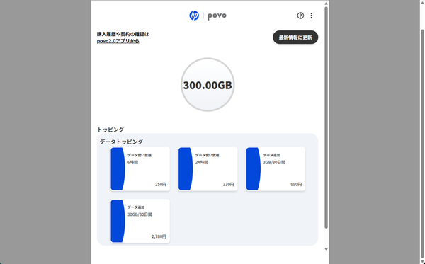 トッピング完了後は、この画面で有効期限や残容量を確認可能だ。もし画面が切り替わらない場合は、「最新情報に更新」をクリックして画面を更新すればいい。
