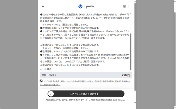 プランを選択すると決済画面が表示される。規約などが表示されるので確認し、スワイプすれば決済が完了する。すぐにトッピングが有効になり、追加の容量やサービスが利用可能だ。