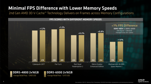 AMDも昨今のDDR5メモリー相場には憂慮しているようだ。AMDはDDR5-6000がオススメ(ただメモリーオーバークロックには違いないので自己責任での動作となる)としているが、DDR5-4800で運用しても平均フレームレートは2%も変化しないと謳っている。メモリークロックが少々低くても3D V-Cacheがそのハンデを吸収してくれるためだ