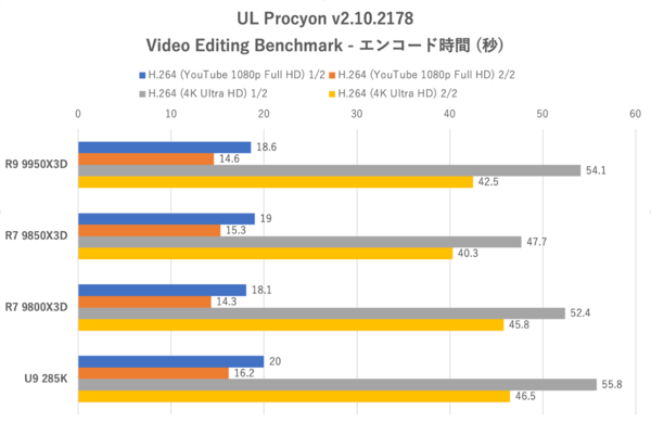 GPUエンコードだとCPUパワーの差が出なくなるように思えるが、Premiere Proの場合はCPUパワーもある程度影響する。その証拠にクロックの高いRyzen 7 9850X3Dのエンコード時間は9800X3Dより明らかに短縮している。Ryzen 9 9950X3DやCore Ultra 9 285Kの処理時間からは、コア数が多すぎても(GPUエンコード時は)かえって足枷になることが示されている。あくまでPremiere ProのGPUエンコード中心で攻めるという限定された状況においては、クロックが上がっただけのRyzen 7 9850X3Dが輝くシーンもあるのだ。
