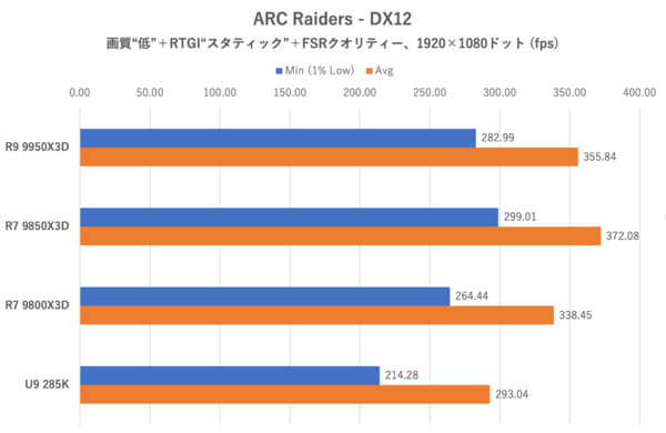 解像度をフルHD、画質を低設定としたのはGPU側のボトルネックを回避するためだ。今回ビデオカードはRadeon RX 9070 XTを採用したが、それでもゲームによっては画質を盛るとGPU負荷がかなり高くなり、CPU本来の性能差が見えにくくなってしまうためである。