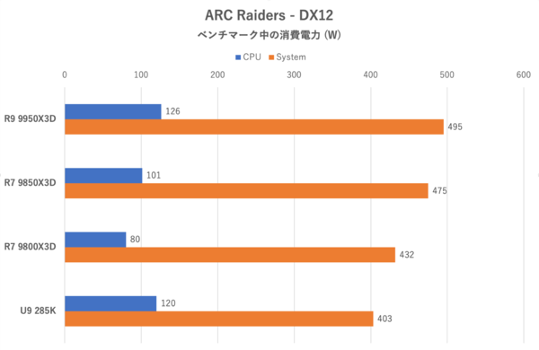 上のグラフはベンチマーク時に観測されたCPUおよびシステム全体の消費電力である。ただしPCI Express x16スロット経由の電力については、計測機材の問題から除外している。まず消費電力でトップに立ったのはRyzen 9 9950X3D。CPUコア数がRyzen 7 9800X3Dより多いため消費電力も高くなり、かつフレームレートも出る(=GPUが電力を消費する)ためこのような結果となった。コア数の多いCore Ultra 9 285Kのシステム全体の消費電力が低いのは、CPUパワー不足からGPUも仕事をしていないから、といえる。