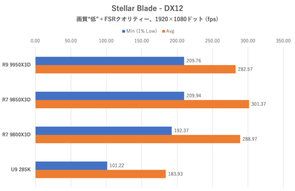 全体傾向としてはARC RaidersやBattleField 6などと同じ。Ryzen 7 9850X3Dと9800X3Dの対決においては、クロックの高い9850X3Dのフレームレートが若干高い。平均フレームレートが伸びるだけでなく最低フレームレートも底上げされるため、カクつきを少しでも減らしたい場合はRyzen 7 9850X3Dを選ぶのがオススメだ。